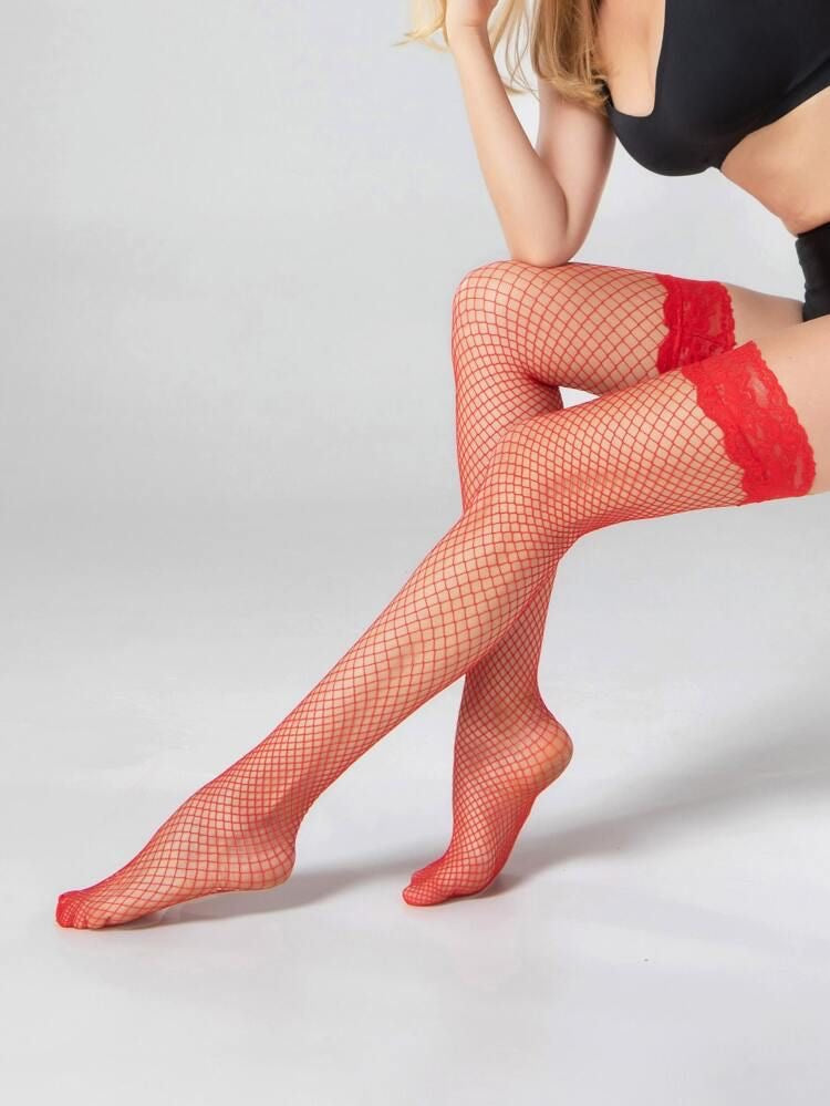 Medias de malla con encaje, licradas y siliconadas en la pretina para que se adhieran a tu piel.